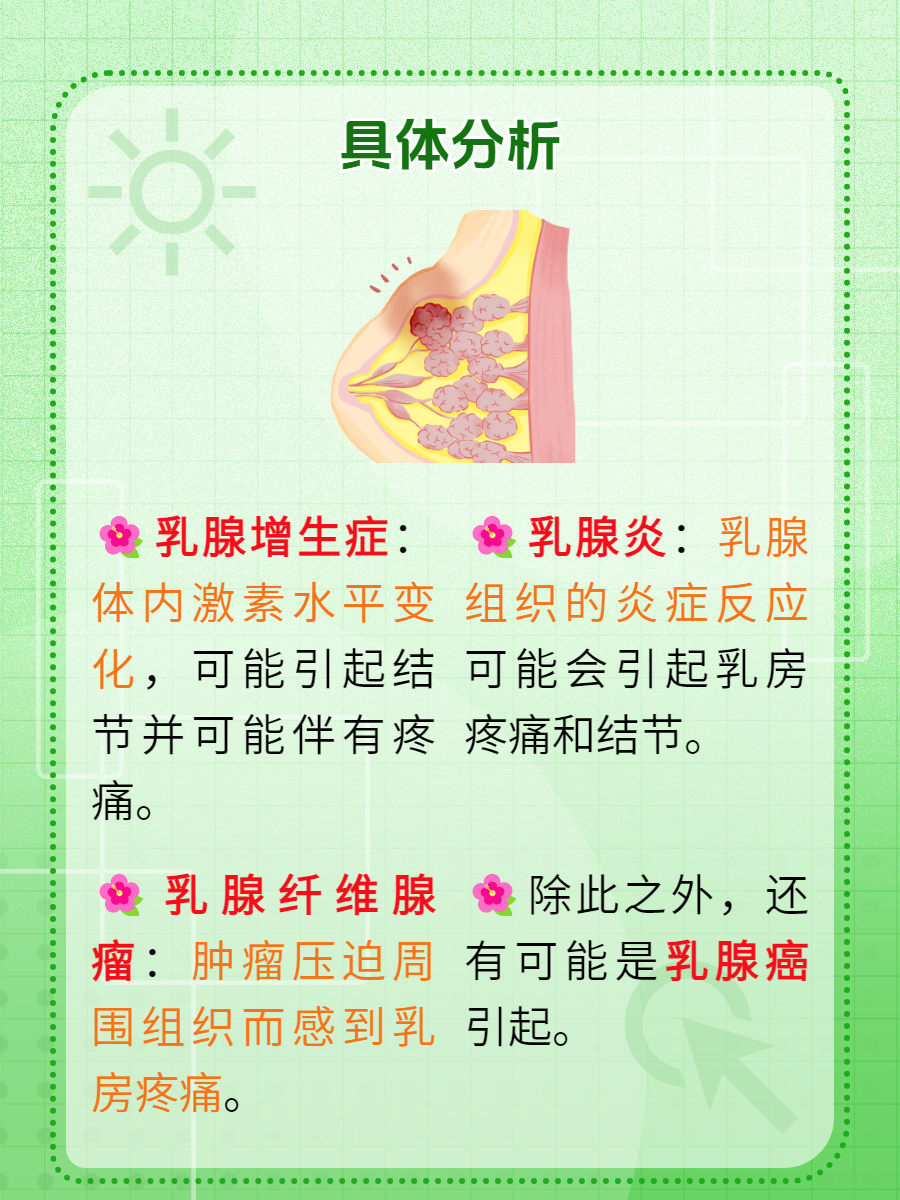 🔬2、乳腺炎:乳腺炎是由于乳头损伤或乳汁淤积导致细菌入侵乳腺组织,引起炎症反应。炎症过程中,伴随有炎症因子的释放以及细菌对乳房的侵蚀,会出现乳房疼痛和结节。
