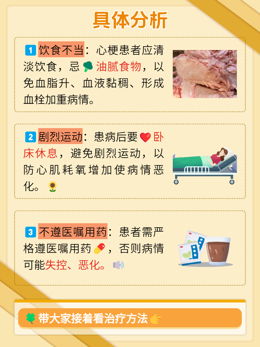 1、饮食不当:患者日常生活中应该保证饮食清淡,切忌食用肥肉、烧烤等油腻的食物,以防血液粘稠度增加,加重急性心肌梗死。油腻食物含有大量的脂肪,摄入过多会使血脂升高。血脂升高就像在血液里加了 胶水,会让血液变得黏稠,容易在血管内形成血栓。而血栓正是导致冠状动脉堵塞,引发心梗的重要原因之一。如果已经患有心梗的患者继续大量摄入这类食物,就会进一步加重病情,增加再次发病的风险。💫🎈