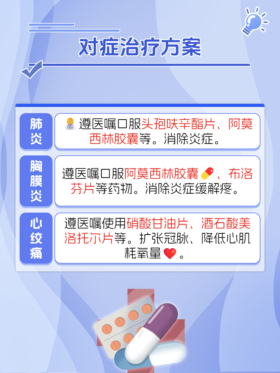 1⃣肺炎:是肺部的感染性疾病,常由细菌、病毒等引起。常有咳嗽、咳痰、发热等症状,反复咳嗽可引起胸口中间疼痛。