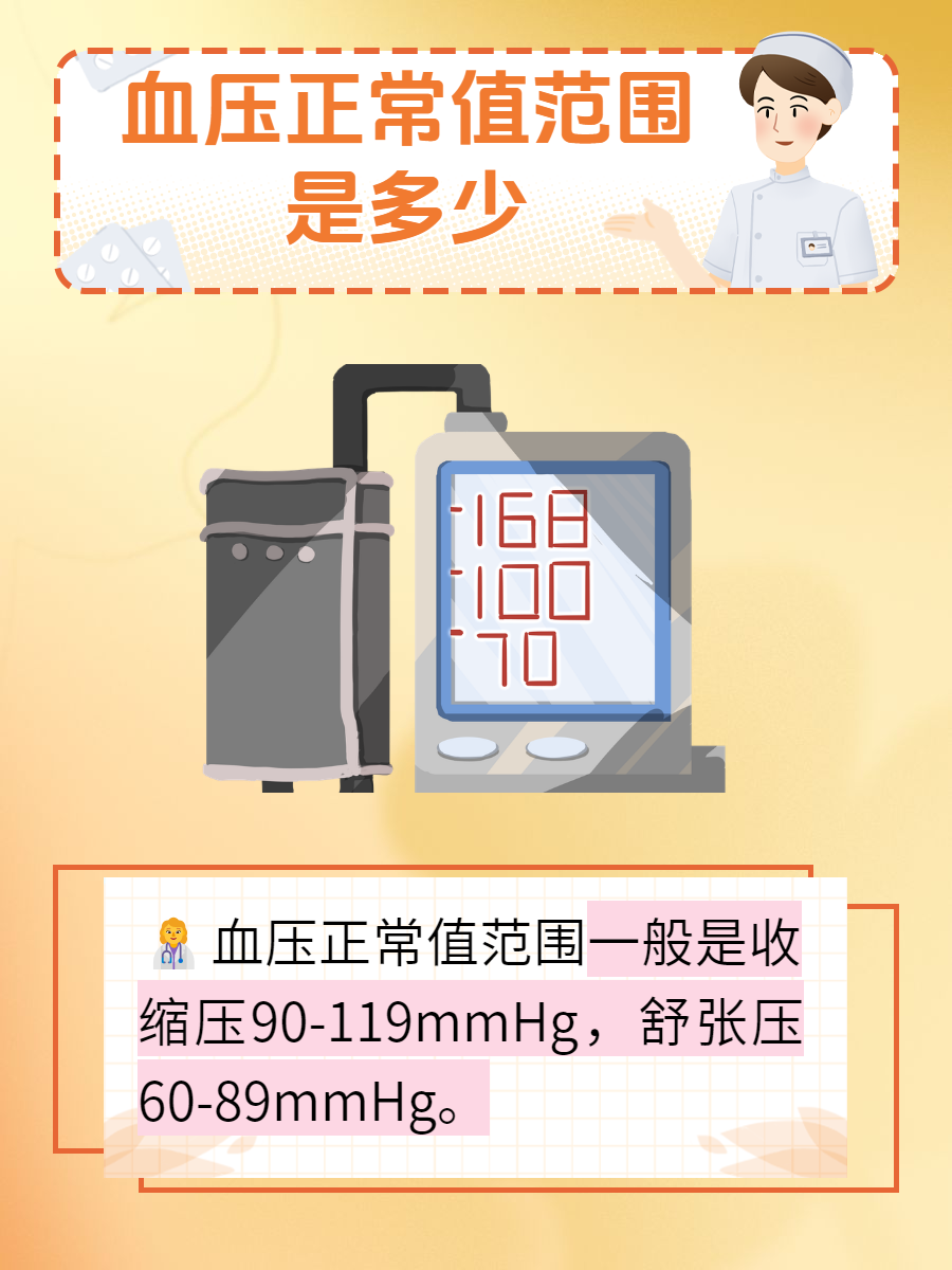 对于成年人来说,血压的正常值范围通常定义为收缩压(高压)在90-119毫米汞柱(mmHg)之间,舒张压(低压)在60-89毫米汞柱之间。这个范围是基于大量研究和临床实践得出的,它反映了心血管系统在静息状态下的正常功能。📈