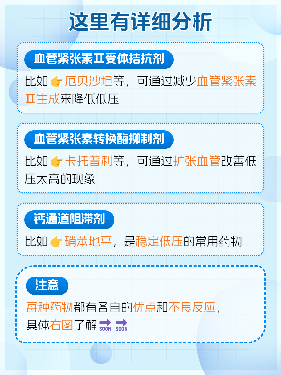 👉血管紧张素转换酶抑制剂:这类药物能够有效地抑制血管紧张素转换酶,具有扩张血管的作用,对于改善低压高有不错的效果,比如➡️依那普利、卡托普利等。