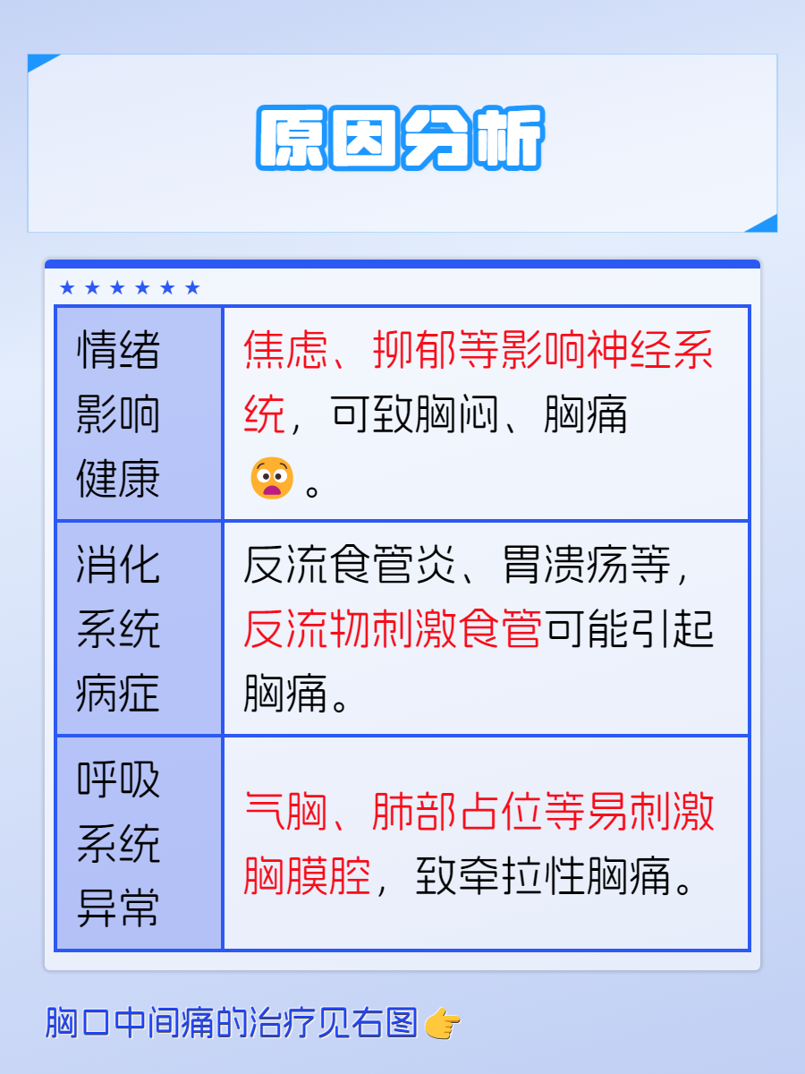 胸口中间疼痛,这种不适感往往让人担忧不已。其实,胸口疼痛的原因多种多样,详情如下: