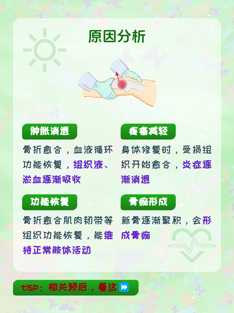 骨折愈合的过程中,往往我们都会通过一些迹象来判断骨折愈合的程度。那么,骨折好转的过程中会出现哪些迹象呢?一起来看一下👇。