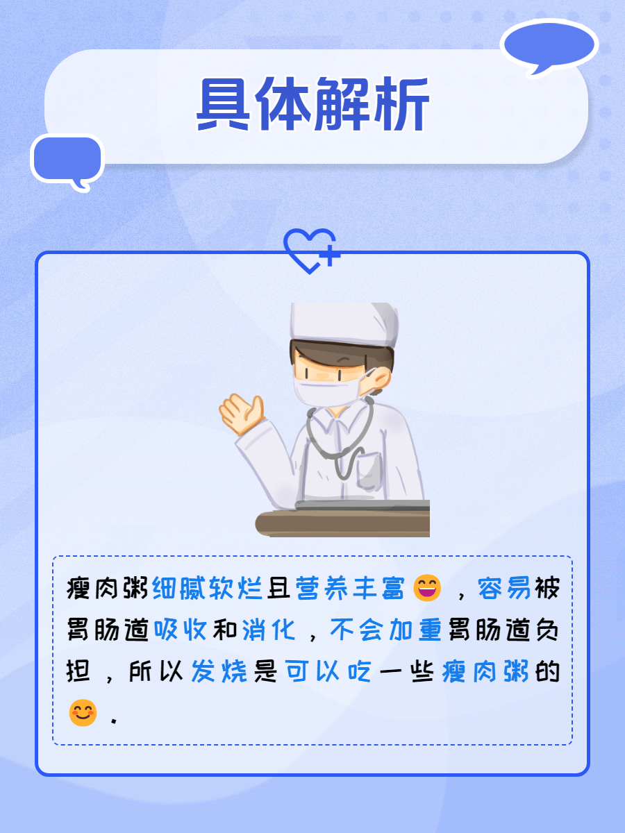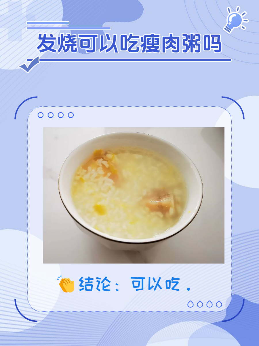 ☀️一般情况下我们的身体在发烧时消化系统会相对变得较弱,适合吃一些营养高易消化的食物,就比如瘦肉粥,因为瘦肉粥口感细腻柔软,容易被身体吸收,且不会给胃肠道带来额外的负担,因此发烧时是可以适量吃瘦肉粥的。