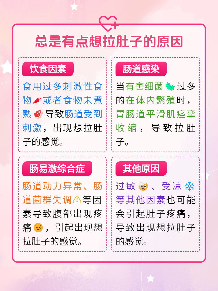 在日常生活中,我们经常会出现想拉肚子的感觉🙍♂️,虽然只是暂时的不适,但或许是对我们肠道出现问题的一个警告⚠️,今天就让我们来一起学习总是有点想拉肚子的原因是什么,排除你心里的疑惑✔️。