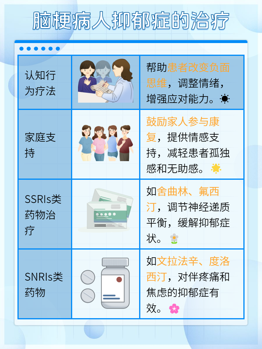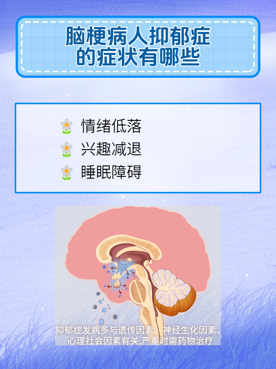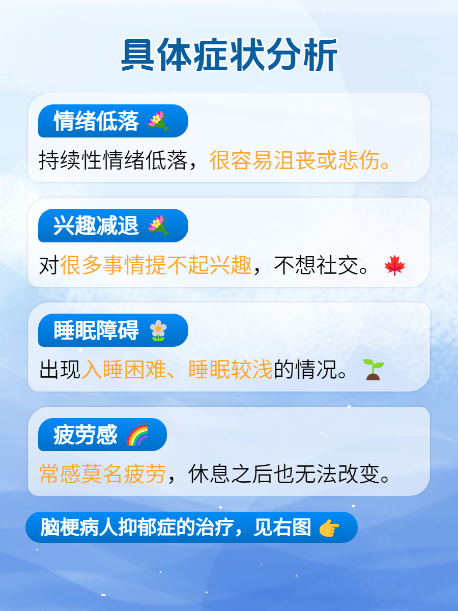 脑梗后,部分患者可能面临情绪与心理的双重挑战,抑郁症便是其中之一。其症状多样,从轻微到严重,不容忽视:🌺