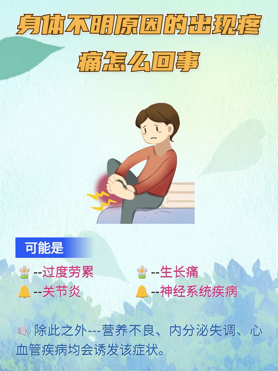 日常生活中,我们或许都经历过身体某个部位突然出现疼痛的现象,但就是不知道引起疼痛的原因是什么,所以让人倍感困惑😖。接下来,我将以专业的角度为大家分析一下身体不明原因出现疼痛的常见原因,希望文章内容对你有所帮助🌈。
