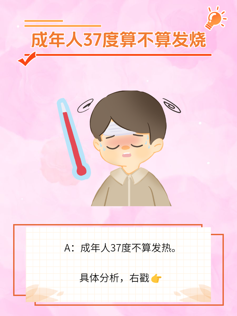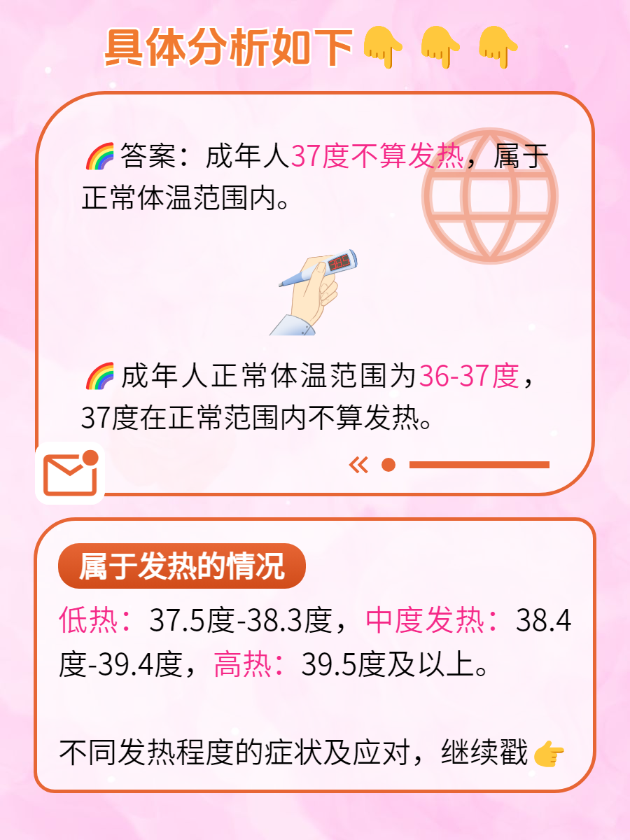 🌈成年人37度一般不算发热。成年人正常体温的范围是36度到37度,由此可见,37度属于正常范围内,不属于发热的情况。一般而言,体温达到37.5度 - 38.3度,属于低热的情况,38.4度- 39.4度属于中度发热,而39.5度及以上则是高热。