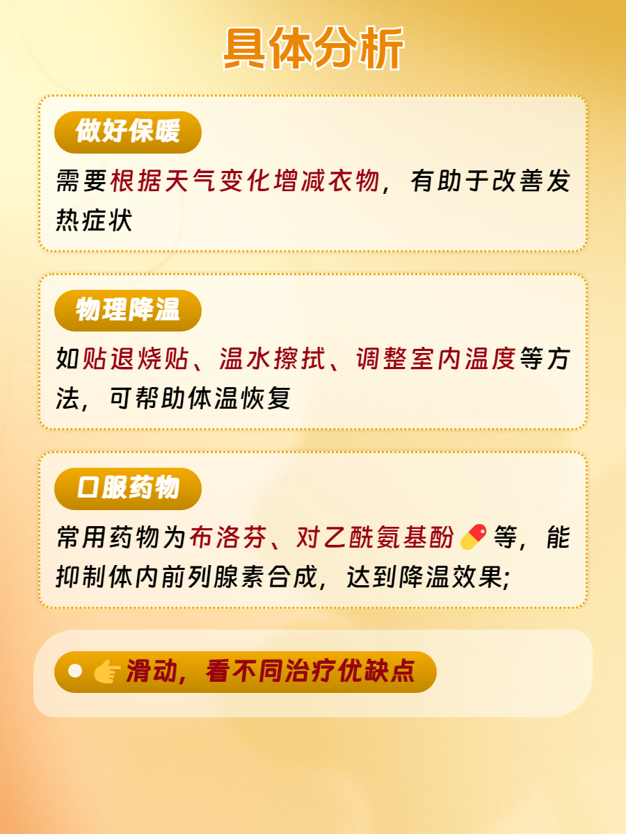 🧥3、口服药物:如果体温持续上升、发烧症状持续不能缓解,或者伴随有其他不适的症状,这个时候可以考虑及时就医,在医生的指导下服用相关的退烧药物💊来治疗。