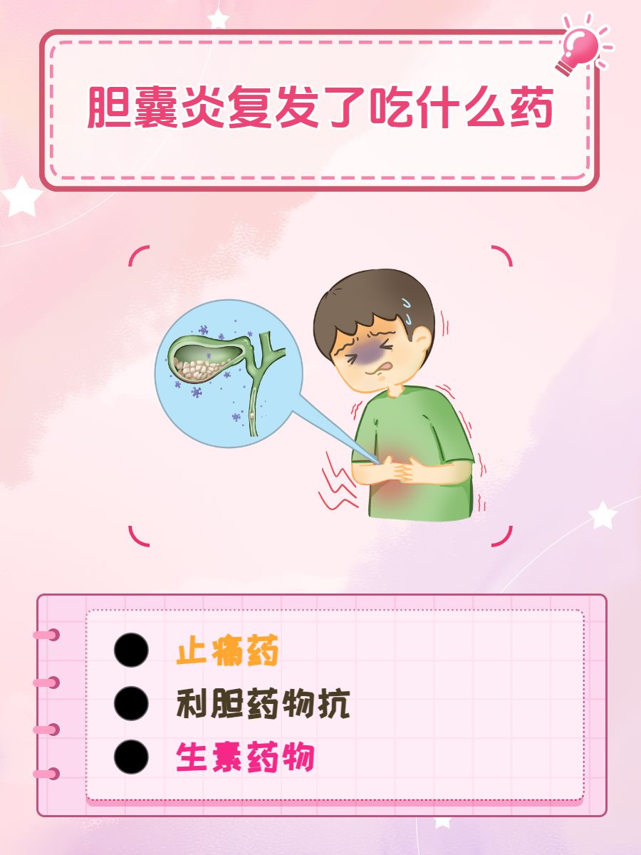 🌈1、止痛药:胆囊炎复发后会引起明显的疼痛症状,此时可以在医生的指导下规范性服用布洛芬、对乙酰氨基酚等药物,能够起到快速止痛的作用。