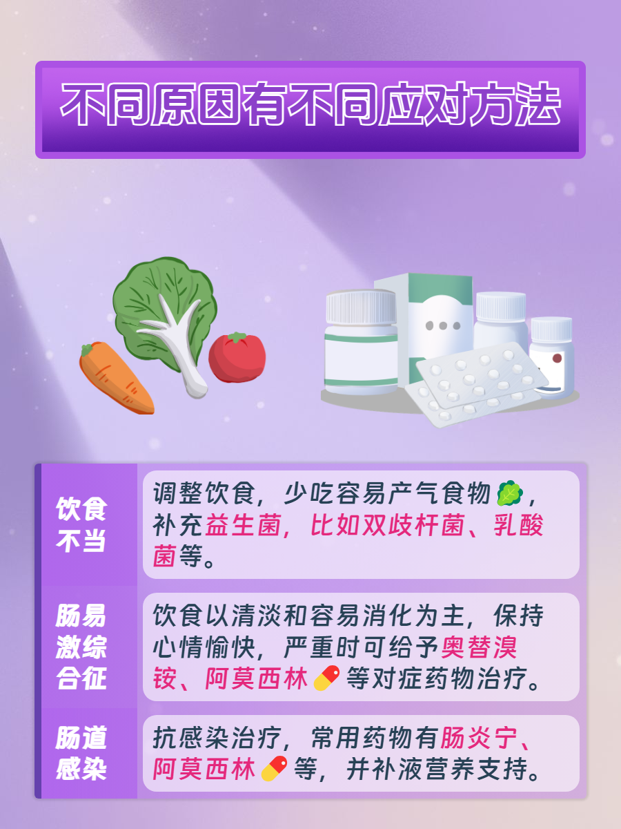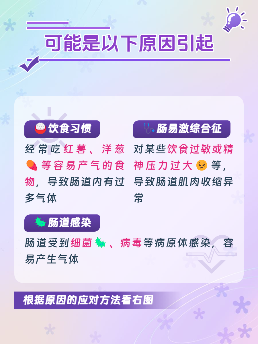 🩺肠易激综合征:肠道对食物刺激、精神压力等更加敏感,容易导致肠道肌肉收缩异常,从而影响肠道运动功能紊乱,未被消化的食物残渣进入大肠,被细菌分解之后会产生大量气体。