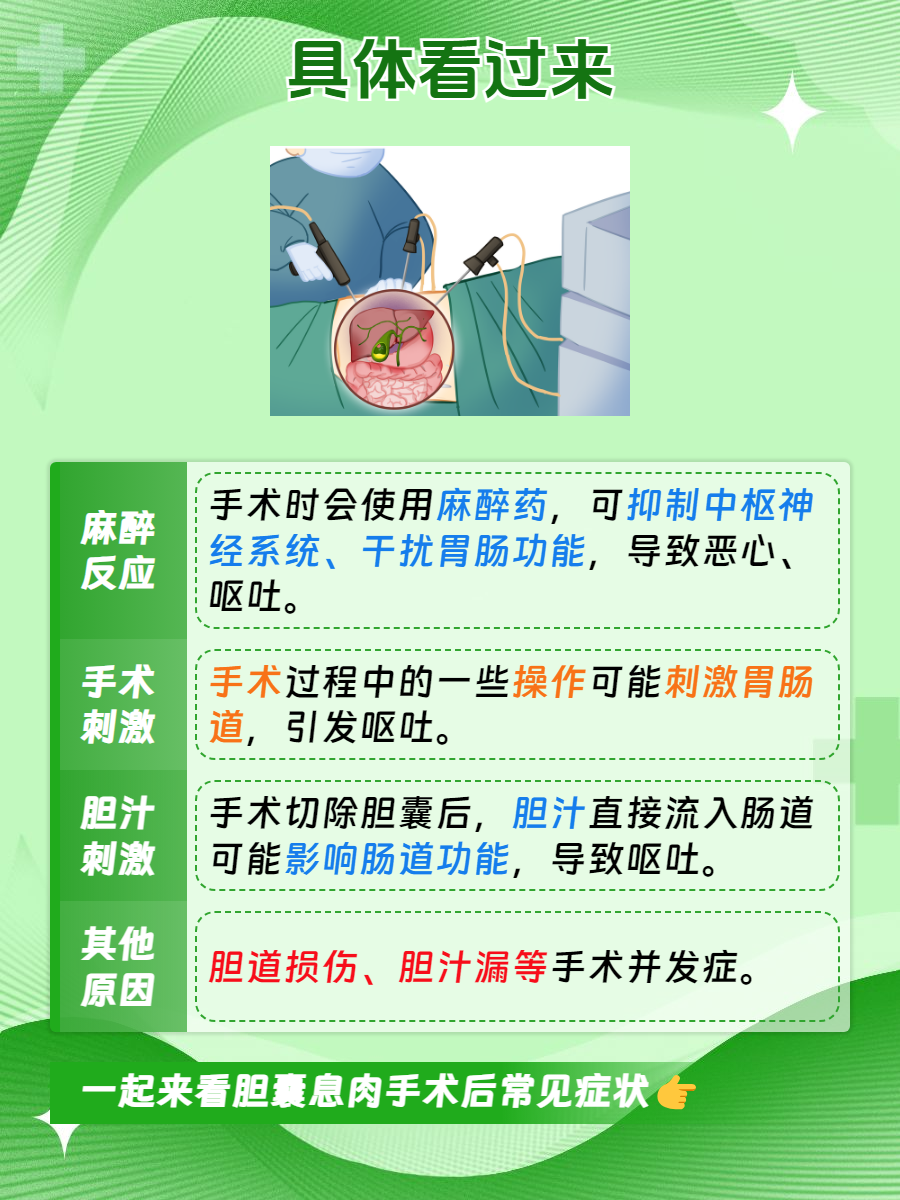 ✔️胆汁刺激:如果患者的胆囊息肉有癌变风险,通过手术切除了胆囊,胆囊切除后会改变胆汁的储存和排放方式,胆汁直接流入肠道后,短期内排放节律和排放量由于不太稳定,可能影响肠道功能,导致呕吐。