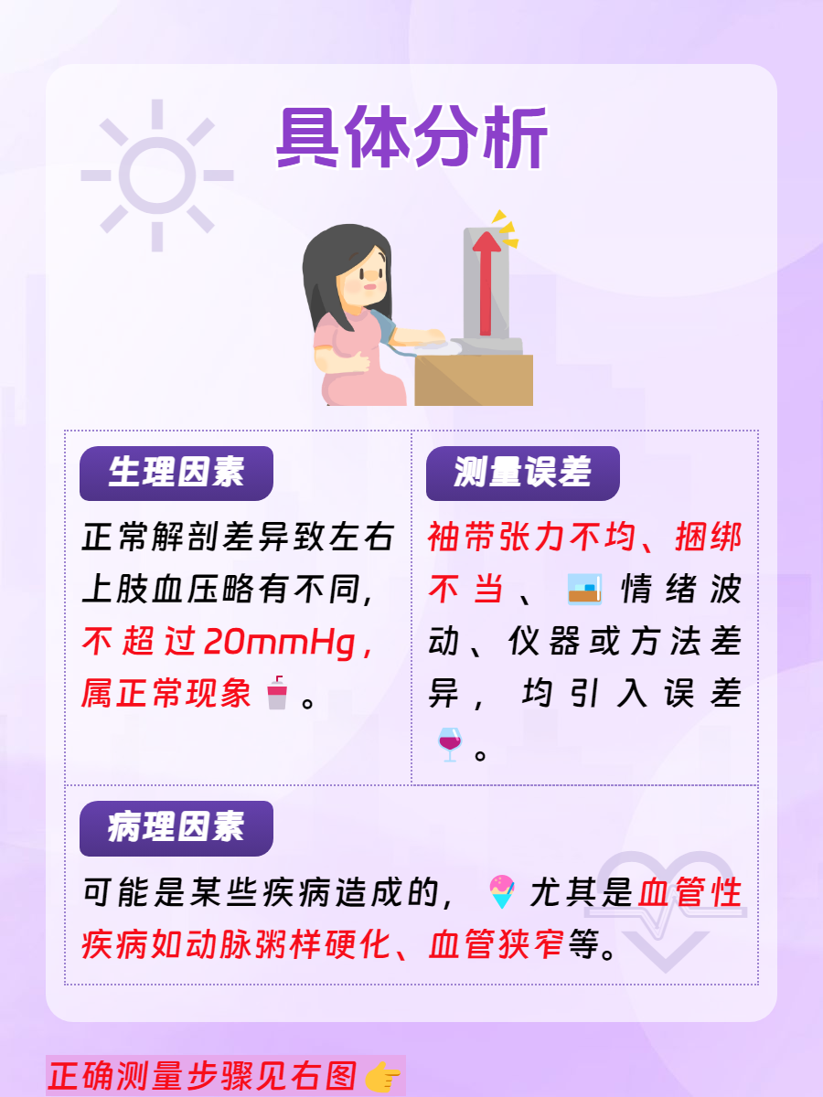 如果差异持续存在或伴有其他不适症状,应及时就医,进行全面的检查,以确定是否存在疾病因素。同时,在日常生活中,我们要养成良好的生活习惯,如合理饮食、适量运动、戒烟限酒等,以维持血压的稳定。💖