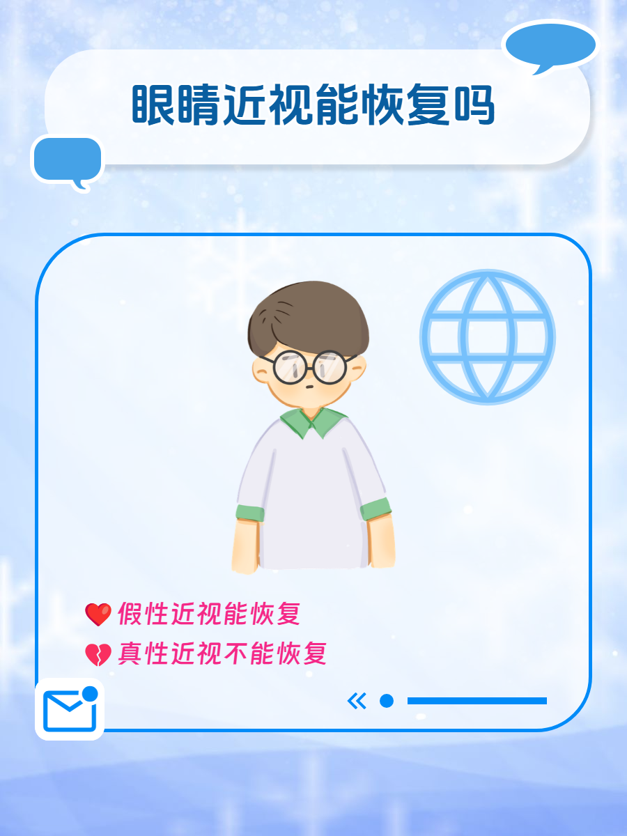 近视在日常生活当中比较常见,其实近视属于比较常见的屈光不正,很多人会提问眼睛近视还能恢复吗😲?其实眼睛近视是否能够恢复,还是需要根据近视的情况来进行判断的。