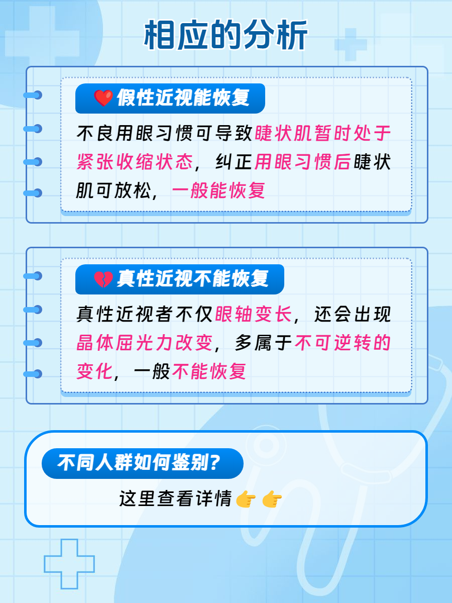 ❤️假性近视能恢复:假性近视通常是由于眼睛的调节功能出现暂时性的异常所致,该种状态很有可能会导致睫状肌处于紧张收缩的状态,引起视物模糊。但通过让眼睛得到充分的休息,可以使睫状肌放松,从而使视力情况得到恢复。