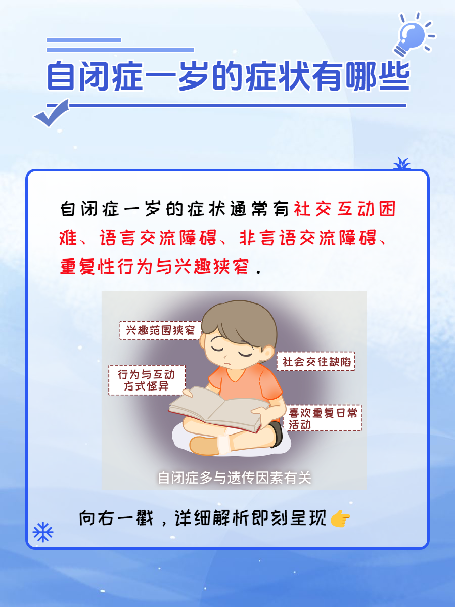 自闭症,也称为孤独症,是一种神经发育障碍,通常在儿童早期出现。目前国际上把儿童自闭症、阿斯伯格、非典型孤独症等统称为孤独症谱系障碍。那么,自闭症一岁的症状有哪些呢?
