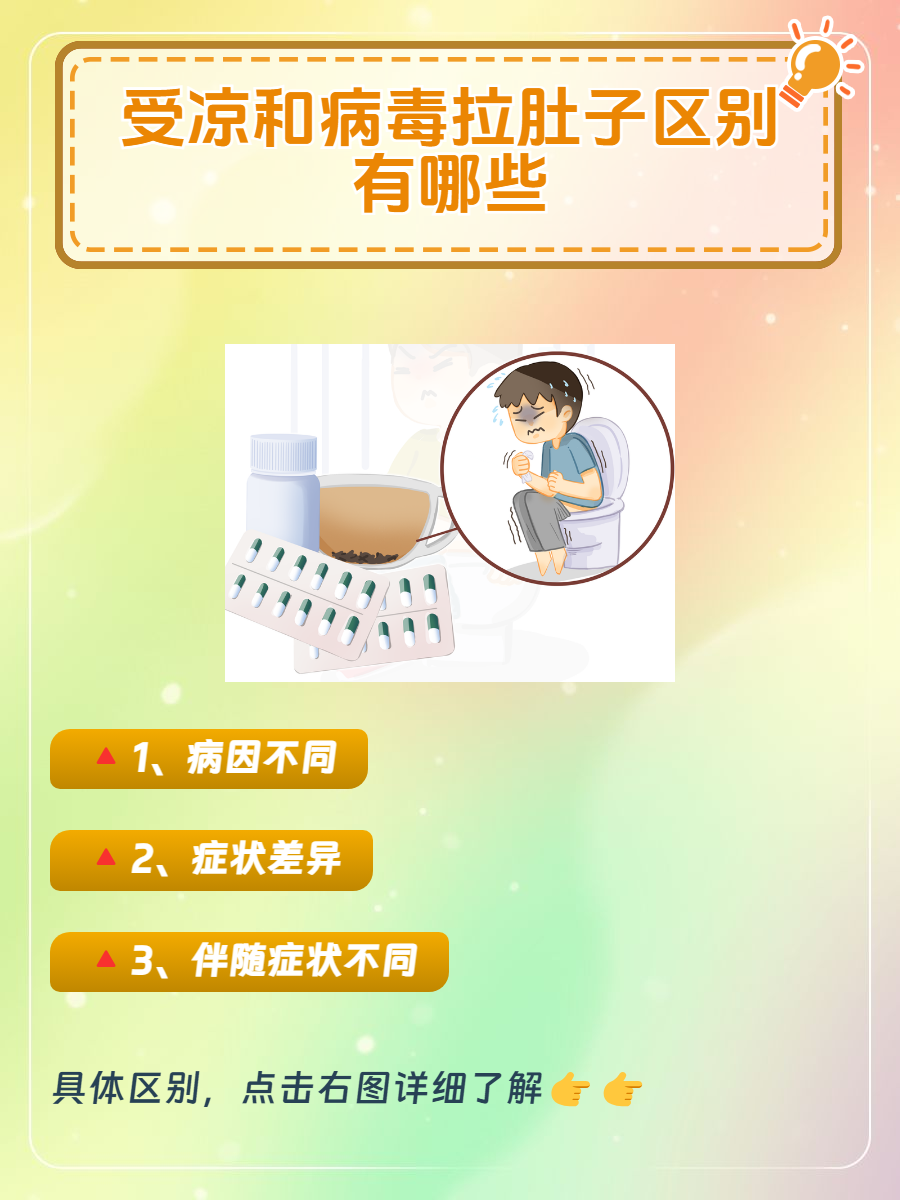 受凉和病毒引起的拉肚子在病因、症状、持续时间、治疗方法和预防措施等方面存在显著差异。了解这些差异可以更好地识别和处理这两种情况。这篇文章对你有启发吗?点个赞,关注我们,健康生活不迷路!