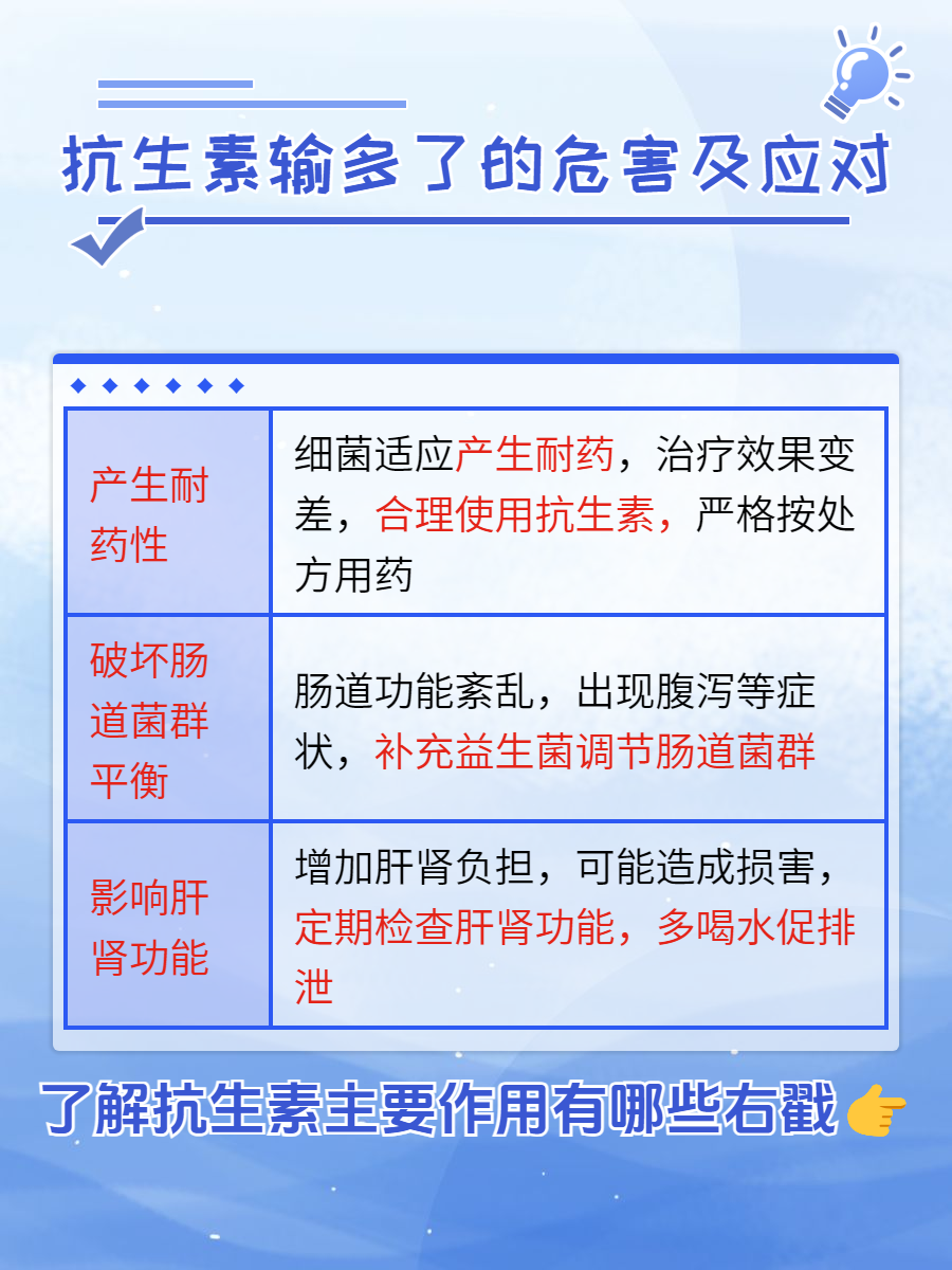 除此以外,抗生素输多了还可能存在其他风险。对于使用抗生素的人,在日常生活中也要注意护理。👇