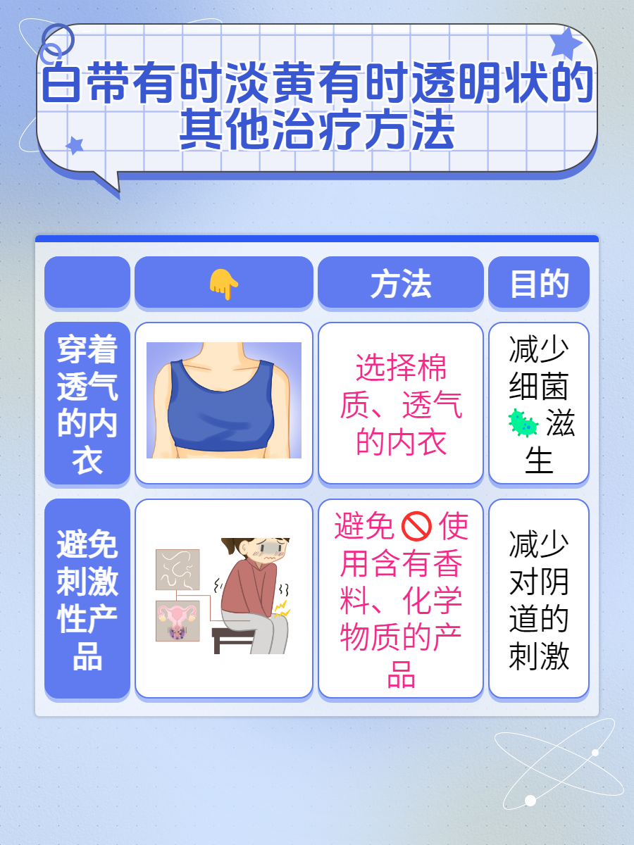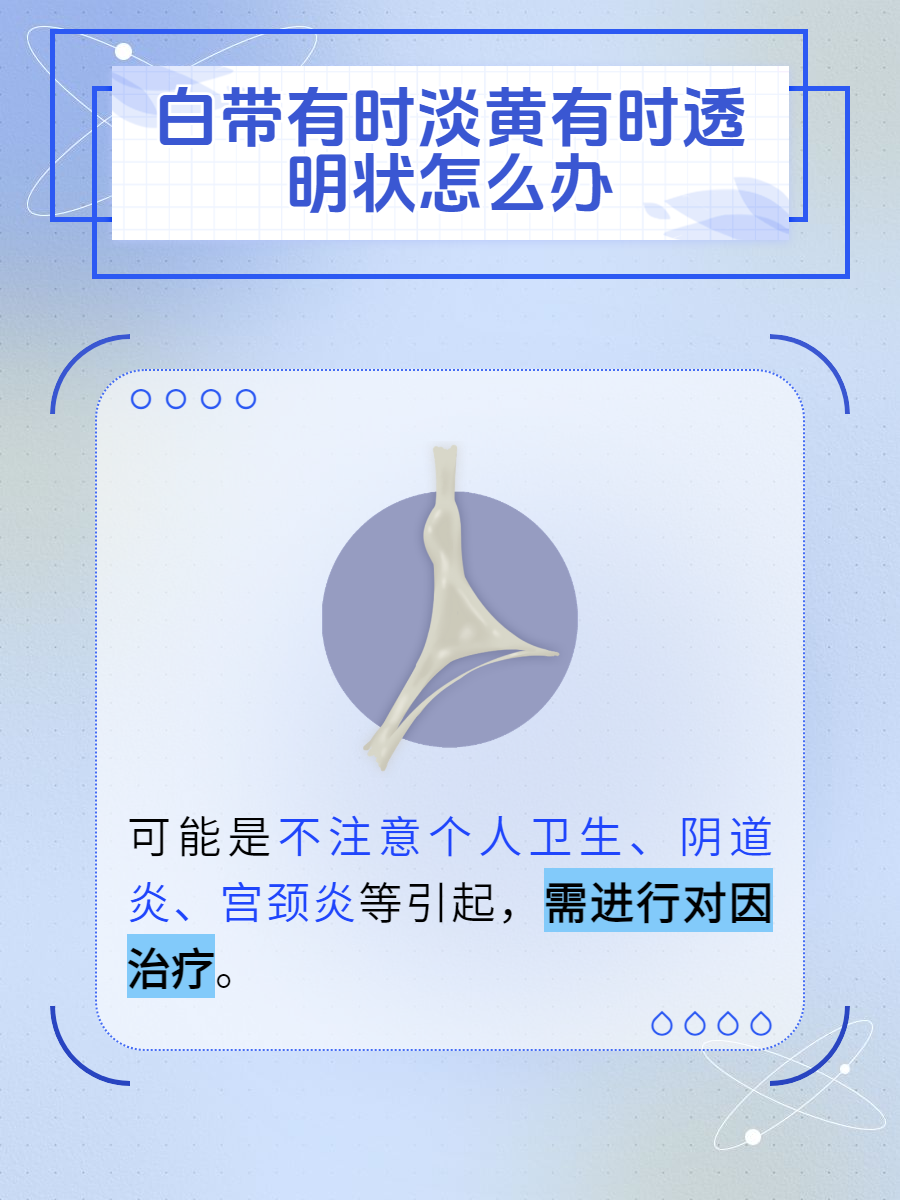 🎈白带有时无色透明有时发黄多考虑是不注意个人卫生引起的,也可能是阴道炎、宫颈炎等疾病导致的,可以通过一般治疗和药物治疗来缓解症状。