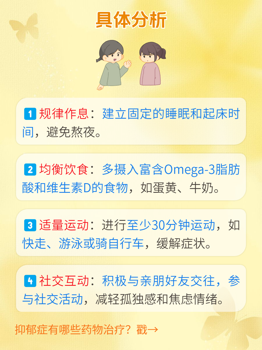 ⭐️2、均衡饮食:均衡饮食能够提供身体所需的营养,对心理健康也有积极影响。多摄入富含Omega-3脂肪酸的食物和富含维生素D的食物如蛋黄、牛奶,这些都有助于提升心情。