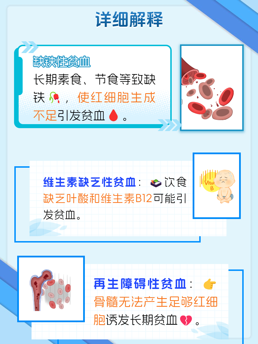 维生素缺乏性贫血🎉:叶酸和维生素B12对红细胞的生成至关重要。饮食中缺乏这些营养素,或者由于吸收问题,如某些胃肠疾病导致的缺乏,都可能引起贫血。🧬