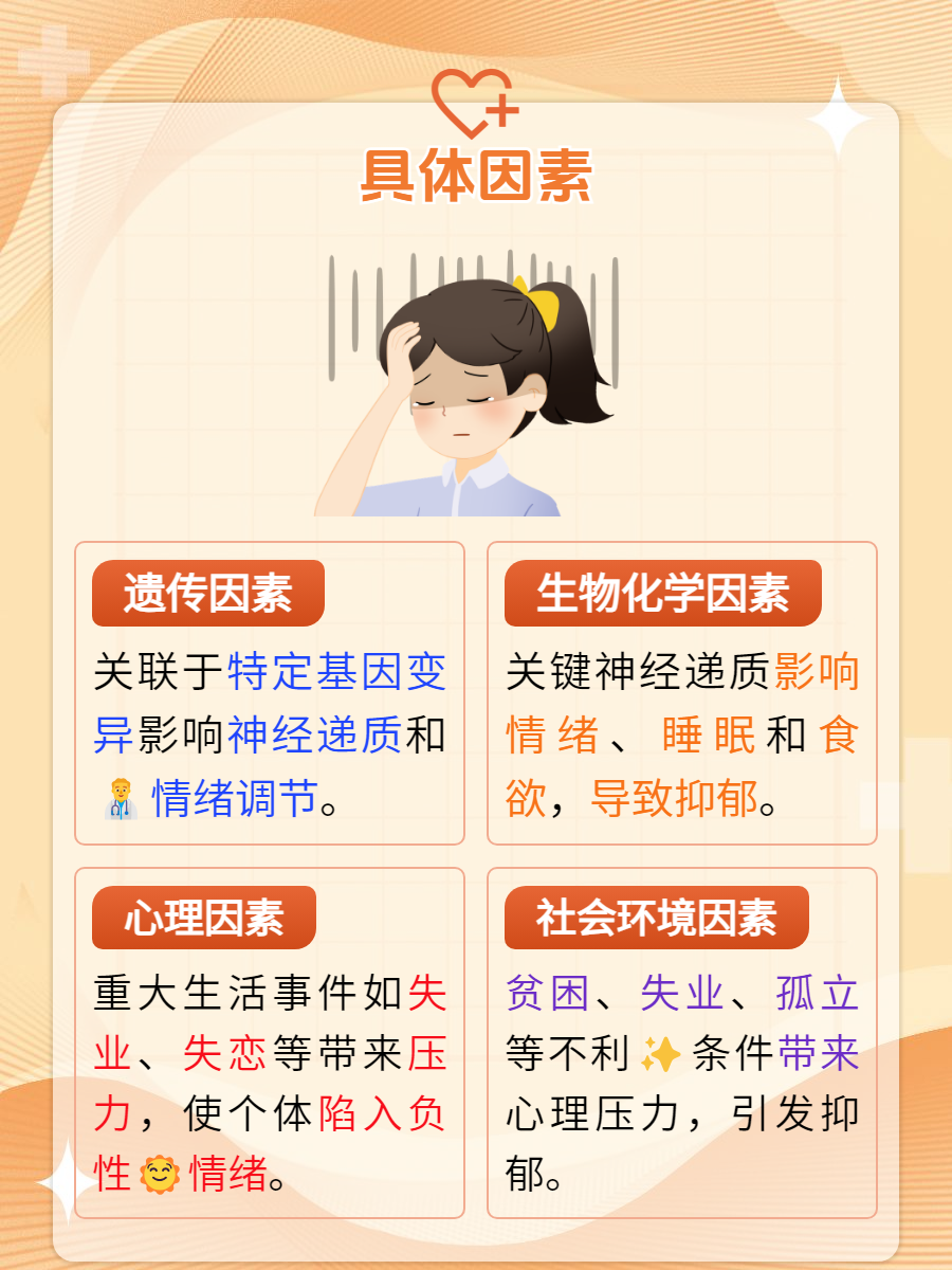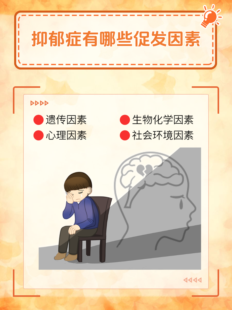 😊总的来说,抑郁症的促发因素多种多样,包括遗传、生物化学、心理、社会和环境等多个方面。了解这些因素有助于我们更好地认识抑郁症的本质和发病规律,从而采取更加有效的预防和治疗措施。让我们共同关注心理健康,为构建和谐社会贡献一份力量。"