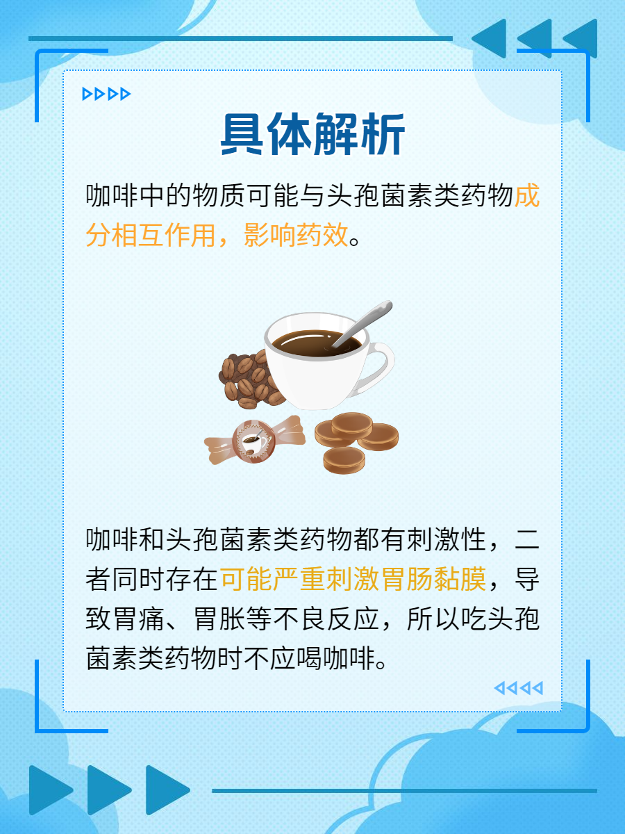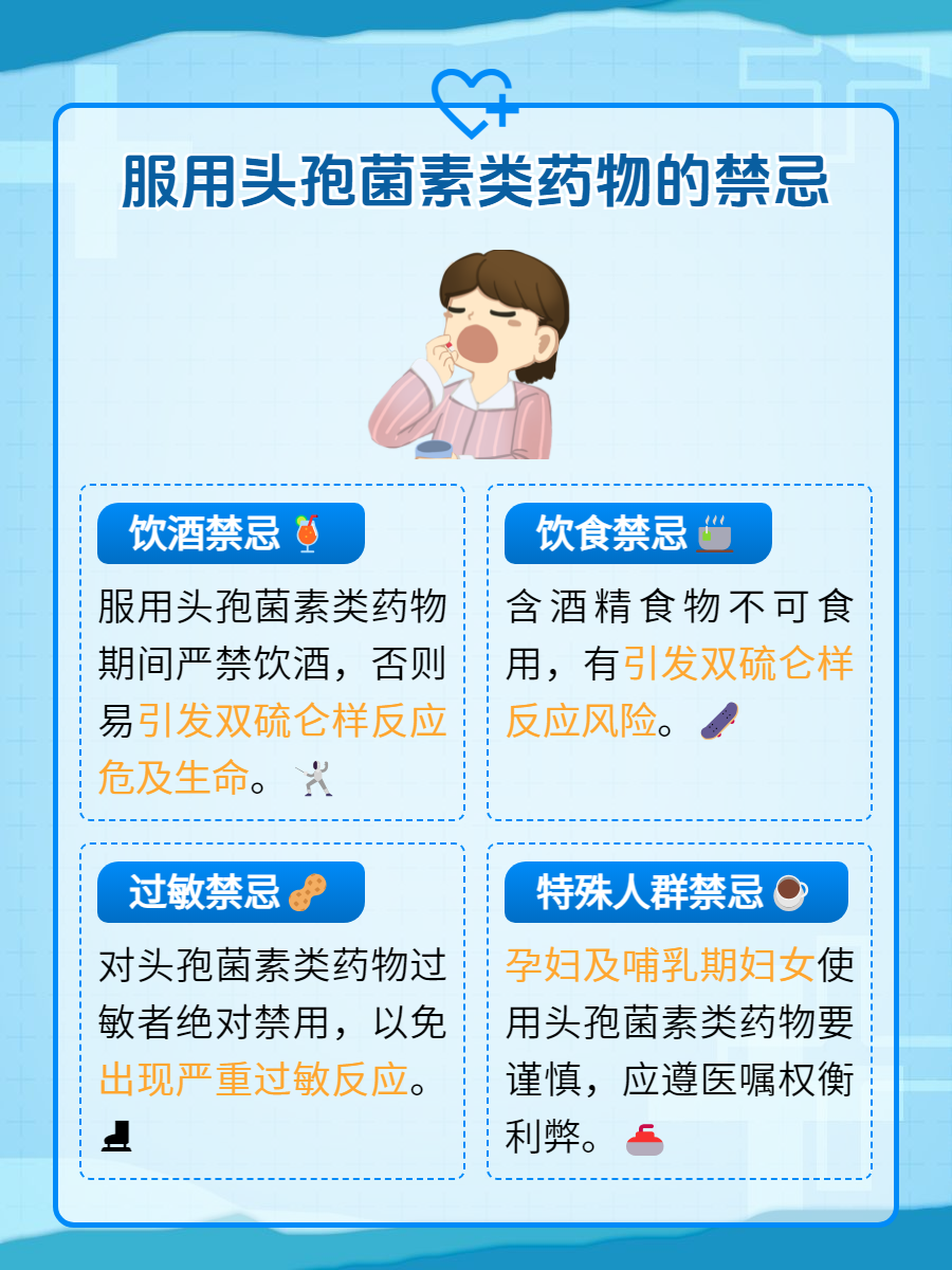 此外,除了咖啡之外,在服用头孢菌素类药物期间,还应避免饮酒以及食用含有酒精的食物,因为酒精与头孢类药物可能会发生双硫仑样反应,这是非常危险的情况。💊