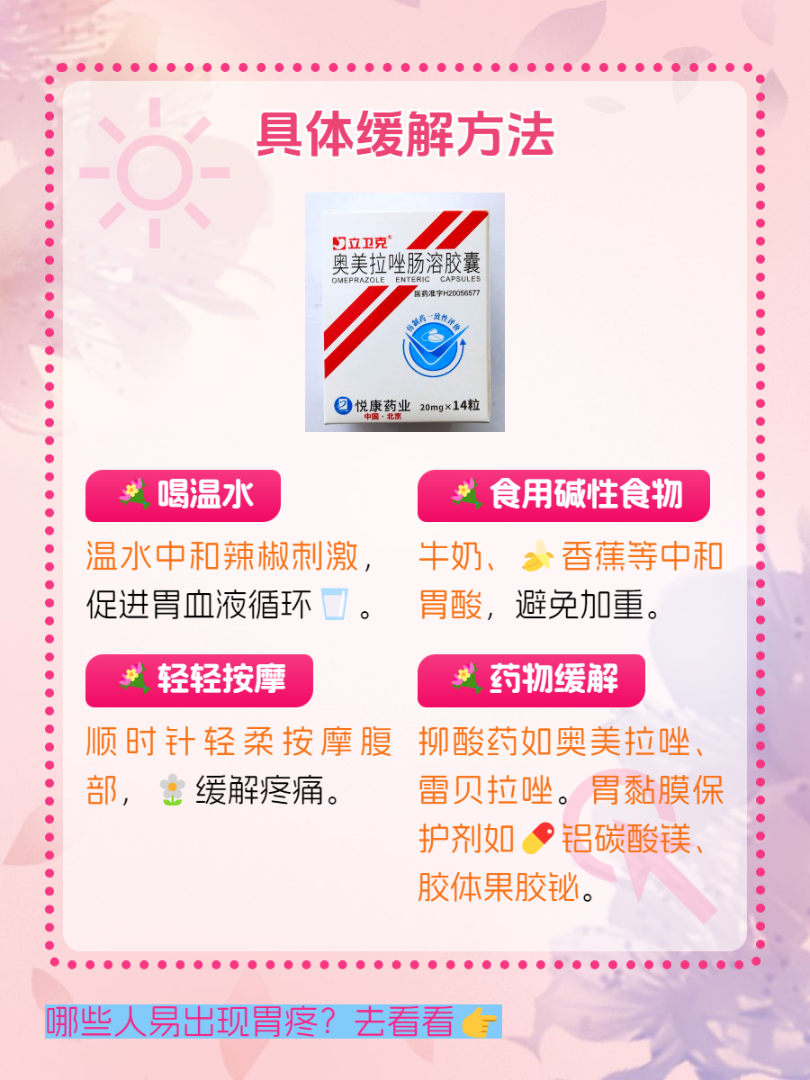 💛如果胃疼较为严重,可以考虑使用一些药物来缓解症状。抑酸药如奥美拉唑肠溶胶囊、雷贝拉唑钠肠溶片能有效抑制胃酸分泌;胃黏膜保护剂如铝碳酸镁片、胶体果胶铋胶囊则能在胃黏膜上形成一层保护膜,防止胃酸侵蚀。但请注意,使用药物前最好咨询医生或药师的建议。😁