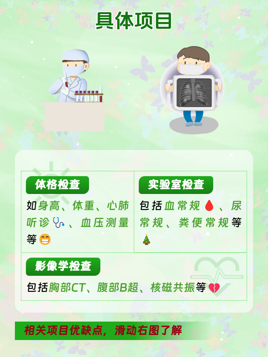 🌹1、体格检查:项目包括身高、体重、心肺听诊、腹部触诊等检查项目,通过这些检查项目,可以对身体的基本状况有一个大概的了解。