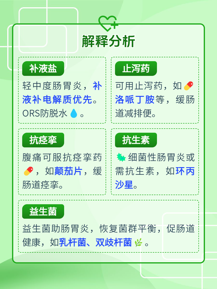 🔍补液盐:首先,对于轻度至中度的肠胃炎,补液和电解质补充是首要的治疗措施。口服补液盐(ORS)可以有效防止脱水,维持电解质平衡。这是非常重要的第一步,尤其是在有腹泻的情况下。🌝