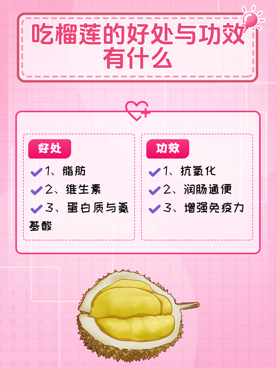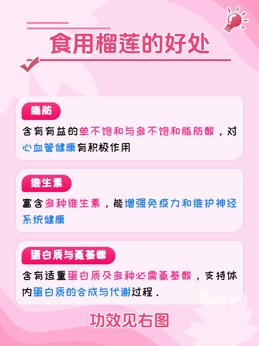 ⚡️3、提高免疫力:榴莲含有丰富的维生素、矿物质和氨基酸,有助于补充身体所需的营养物质,提高免疫力,增强身体抵抗力。
