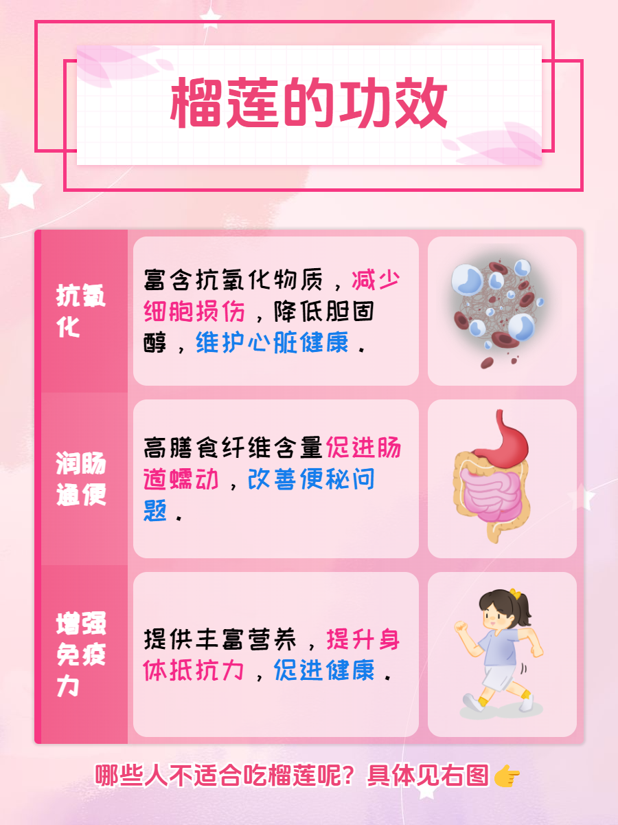 ⚡️2、润肠通便:榴莲富含膳食纤维,能够吸收肠道内的水分,膨胀后刺激肠壁,促进肠道蠕动,帮助排便。对于经常便秘的人群,适量食用榴莲可改善便秘症状。