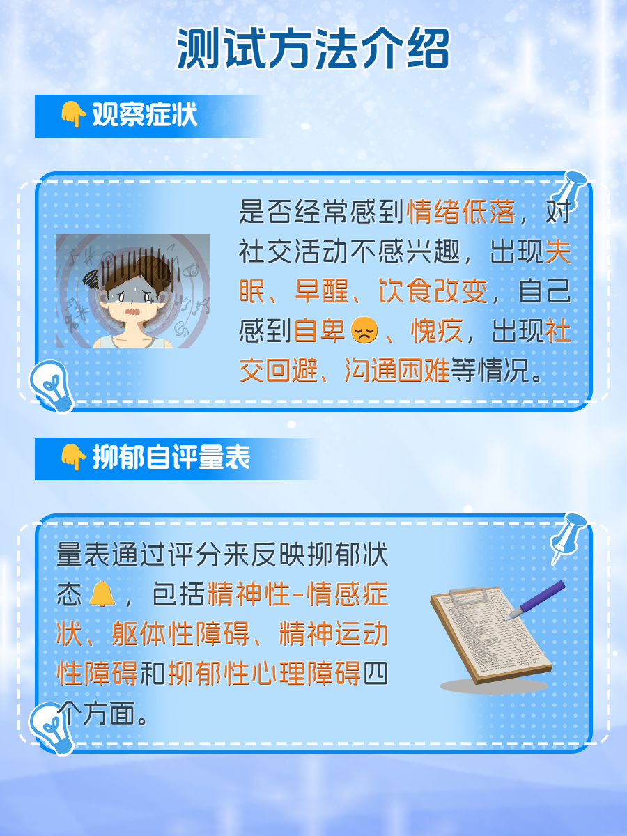 除了自我观察,还有一些专业的测试工具可以帮助我们初步判断是否抑郁。💻比如抑郁自评量表,通过回答一系列问题,可以得出一个分数,从而初步判断抑郁的程度。当然,这些测试工具只是一个参考,不能作为确诊的依据。如果怀疑自己有抑郁倾向,最好还是去医院找专业的医生进行评估和诊断。👩⚕️
