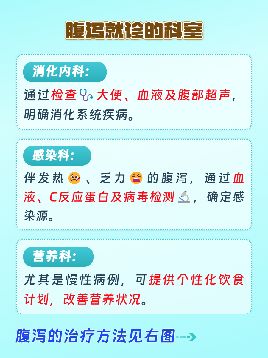 🔔2、感染科:如果腹泻伴有发热、乏力等症状,可能是由细菌或病毒感染引起的,此时感染科医生会进行血常规检查、C反应蛋白检测、病毒核酸检测等来确定感染类型和程度,并给出相应的抗感染治疗