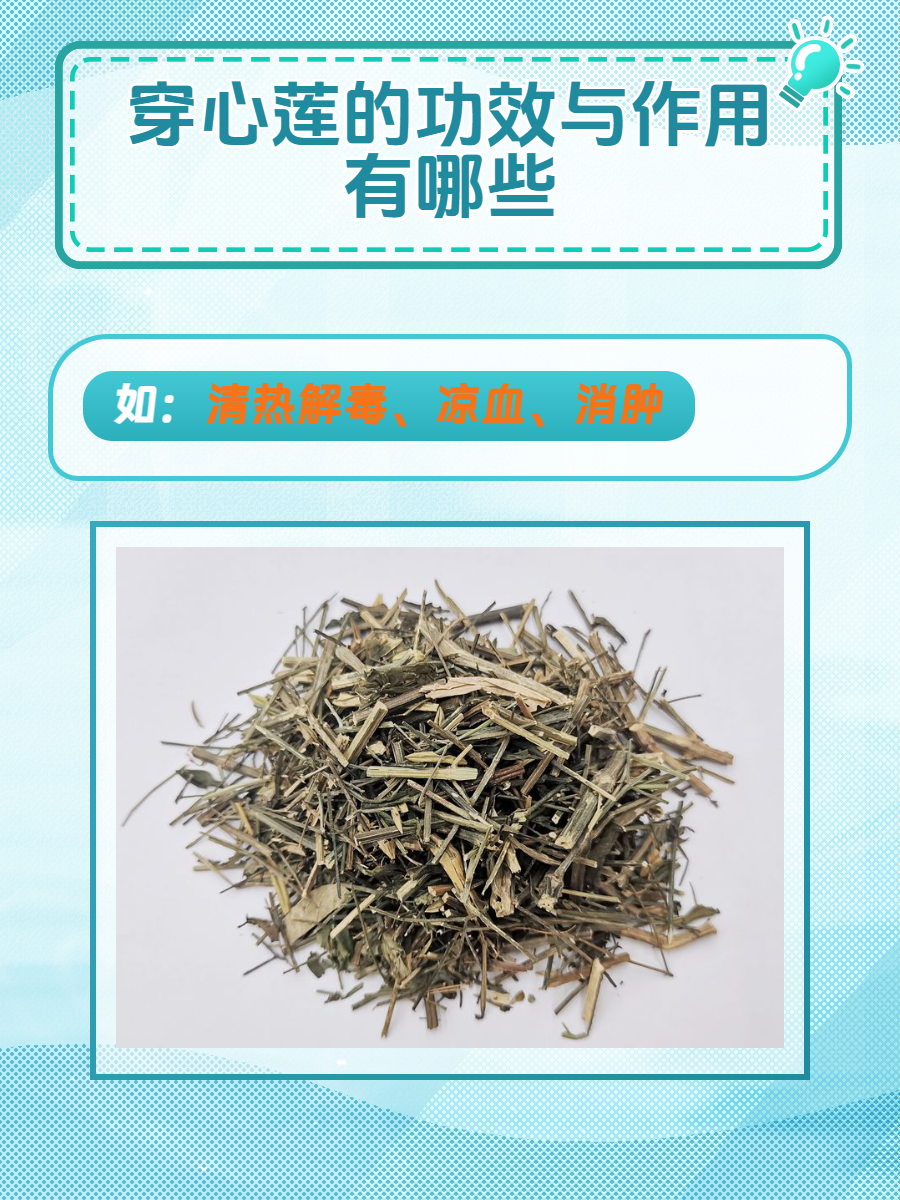🐾1、清热解毒:穿心莲具有很强的清热解毒作用,常用于治疗热毒病症,如感冒发热😷、咽喉肿痛等。因外感风热而出现的发热、咳嗽、头疼等症状也可以用穿心莲来缓解。