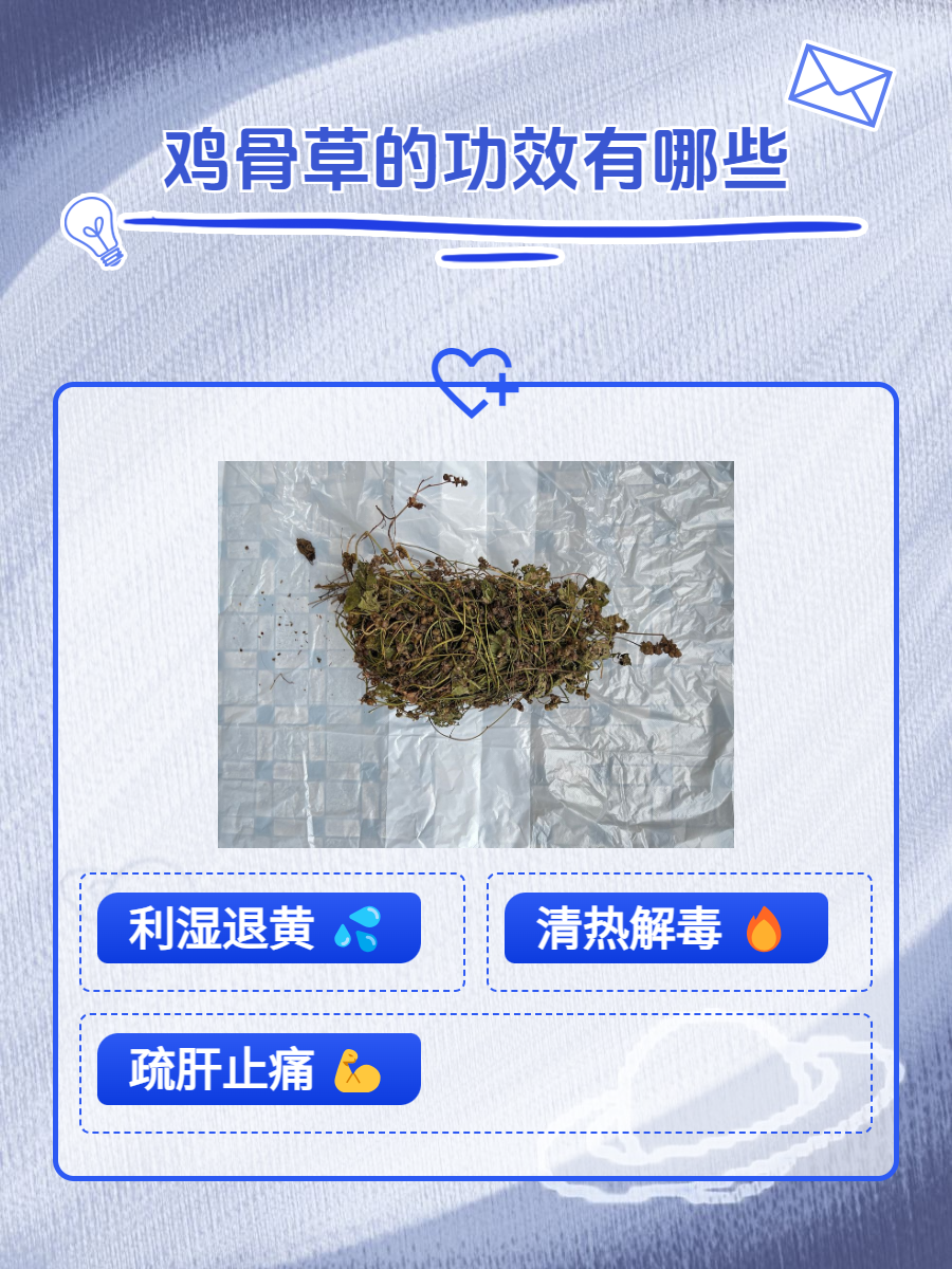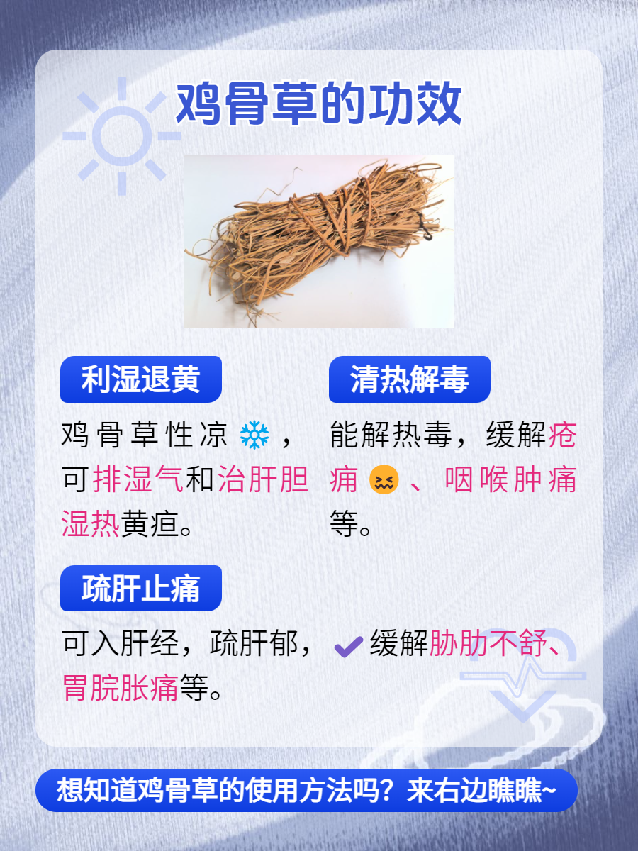 利湿退黄 💦:鸡骨草味甘、微苦,性凉,能有效治疗肝胆湿热引起的黄疸,帮助身体排除多余湿气。