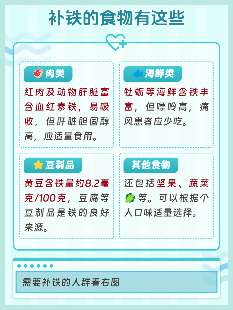 🥩肉类:比如红肉动物、肝脏、动物血,红肉中的铁元素含量较高,而且以血红素铁的形式存在,容易被人体吸收利用。动物肝脏中也是血红素铁,但动物肝脏中含有较高的胆固醇,所以不宜过量吃。