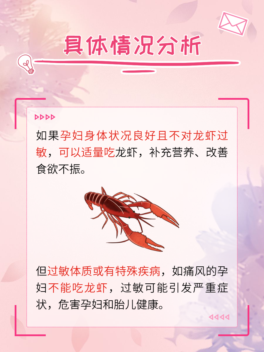👉但是,如果孕妇本身有过敏体质,对龙虾过敏,那么在孕期绝对不能吃龙虾。过敏可能会引发皮疹、瘙痒、呼吸困难等严重症状,对孕妇和胎儿的身体健康造成极大危害。另外,如果孕妇在孕期有特殊的疾病或身体不适,比如痛风等,需要控制嘌呤摄入,那么吃龙虾就要谨慎,因为龙虾的嘌呤含量较高。