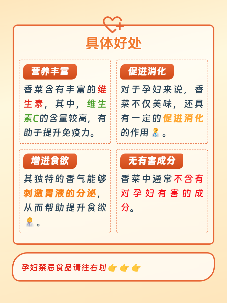 1️⃣营养丰富:香菜富含多种维生素,特别是维生素C,它有助于增强孕妇的免疫力,促进铁元素的吸收,从而预防孕期贫血。此外,香菜还含有膳食纤维、钾、钙等多种矿物质,这些都对孕妇的身体健康有益。