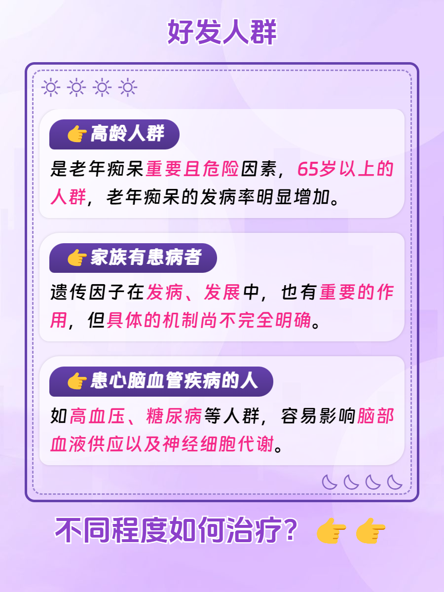 👉高龄人群:高龄人群是老年痴呆比较常见的人群,随着年龄逐渐的增加,机体的各项生理机能会逐渐衰退,老年痴呆的发病率也会明显增高。