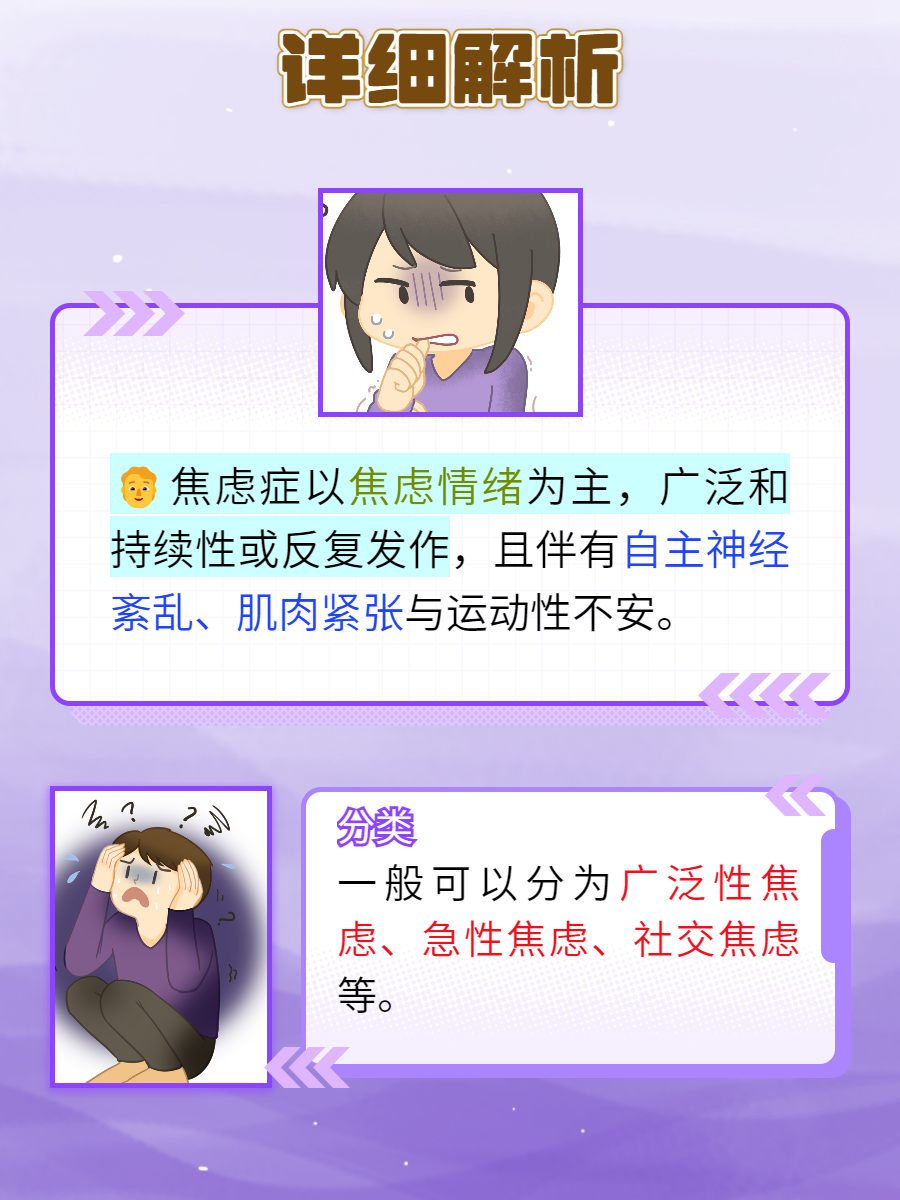 其实焦虑症是一种以焦虑情绪为主的神经症,以广泛和持续性焦虑或反复发作的惊恐不安为主要特征,常伴有自主神经紊乱、肌肉紧张与运动性不安。💔一般可以分为广泛性焦虑、急性焦虑、社交焦虑等,其中💔广泛性焦虑也叫慢性焦虑,患者大概每天都存在着焦虑不安、坐立不安、出汗、身上不舒服、睡眠障碍等情绪,通常持续6个月以上。💔而急性焦虑患者会突然出现紧张不安、出汗、濒死感等症状,每次发作通常不超过两小时,但可能反复发作。由于担心发病时得不到帮助,60%的患者会产生回避行为,如不敢单独出门,不敢到人多热闹的场所,进而可能发展为场所恐惧症。💔另外,社交焦虑患者在与人交往时会出现心慌、胸闷、脸红等症状,不敢到人多的地方去。