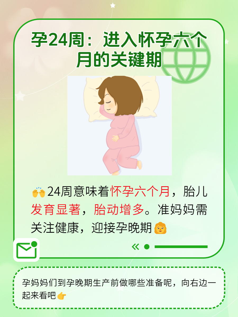 👶24周标志着怀孕六个月的重要里程碑。从最后一次月经开始计算,24周正好是孕中期接近尾声的时候。在这个阶段,胎儿已经发育得相当完善,妈妈们也会感受到更加频繁和明显的胎动。孕24周,准妈妈们进入了怀孕的下半程,这是一个关键的时期,胎儿的器官系统继续成熟,体重也在稳步增加,身长也在不断增长。