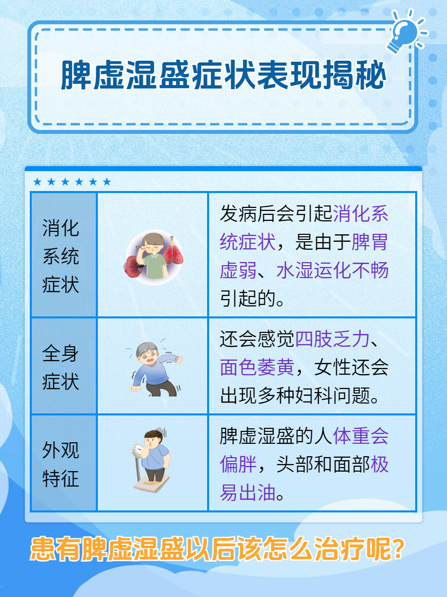 🌼1、消化系统症状:患者常感胸闷、腹胀,食欲不振,食物消化不良,甚至出现便溏或便秘。由于脾胃虚弱,水湿运化不畅,还会出现口中黏腻、味觉减退等症状。