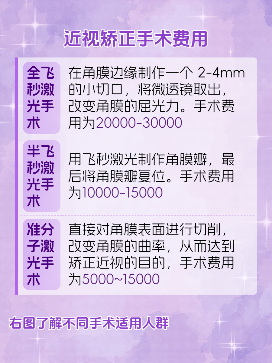 近视手术费用并不是固定的,会受到多种因素的影响,以下是一些常见近视矫正手术的大致费用: