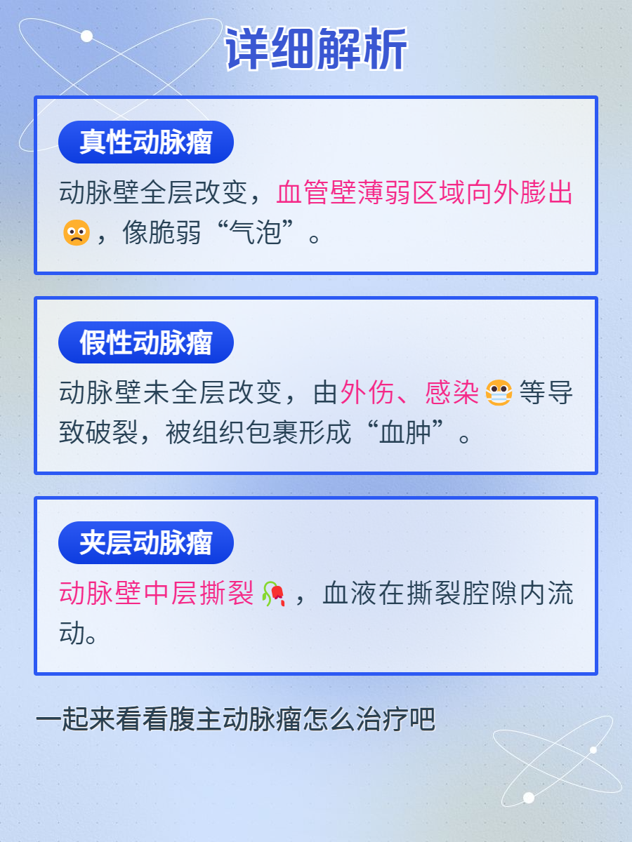 1、真性动脉瘤:这是最常见的腹主动脉瘤类型,主要是由于动脉壁的全层结构发生了改变,导致血管壁薄弱区域向外膨出。它就像是一个脆弱的“气泡”,需要特别小心呵护。