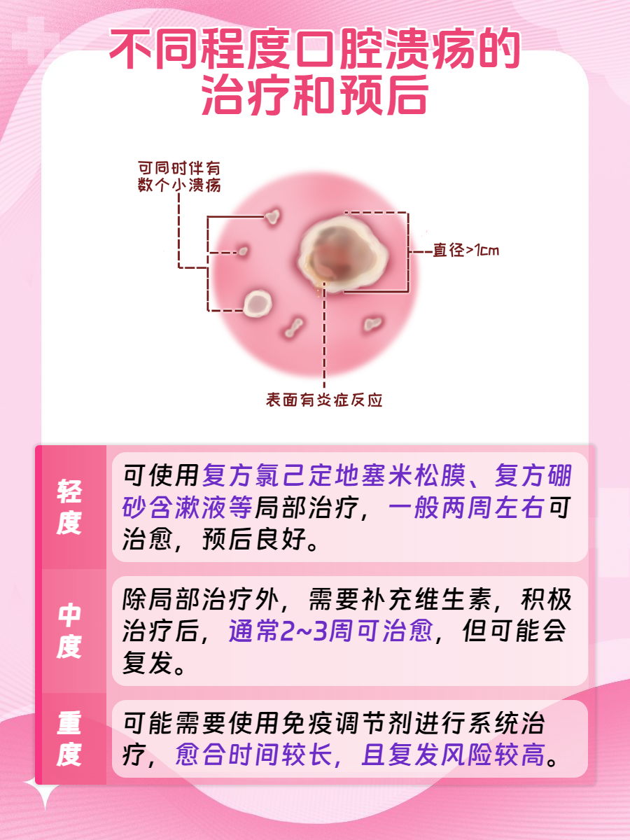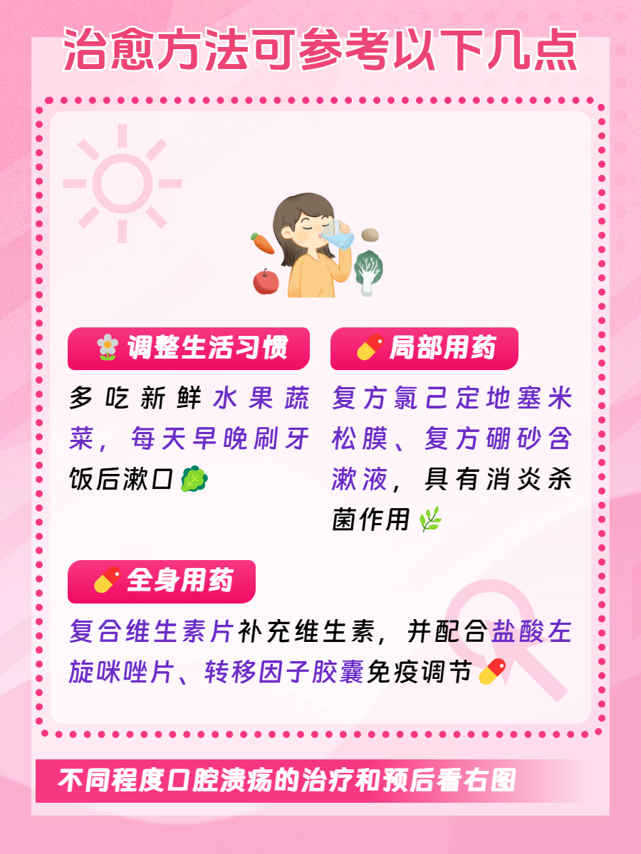 口腔溃疡的治愈方法需要考虑多种因素,如果反复发作,建议及时就医,以明确原因针对性治疗✔️。同时也希望大家能保持愉快的心情,避免精神压力过大。