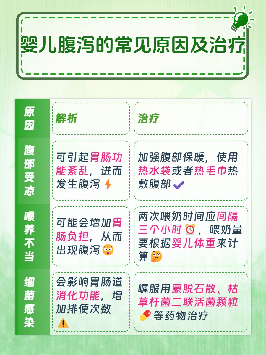 如果家长发现婴儿存在腹泻情况,应当及时带领婴儿前往医院求助医生,在医生指导下明确引起腹泻的具体原因,比如腹部受凉、喂养不当、细菌感染等,并根据引起原因来治疗。