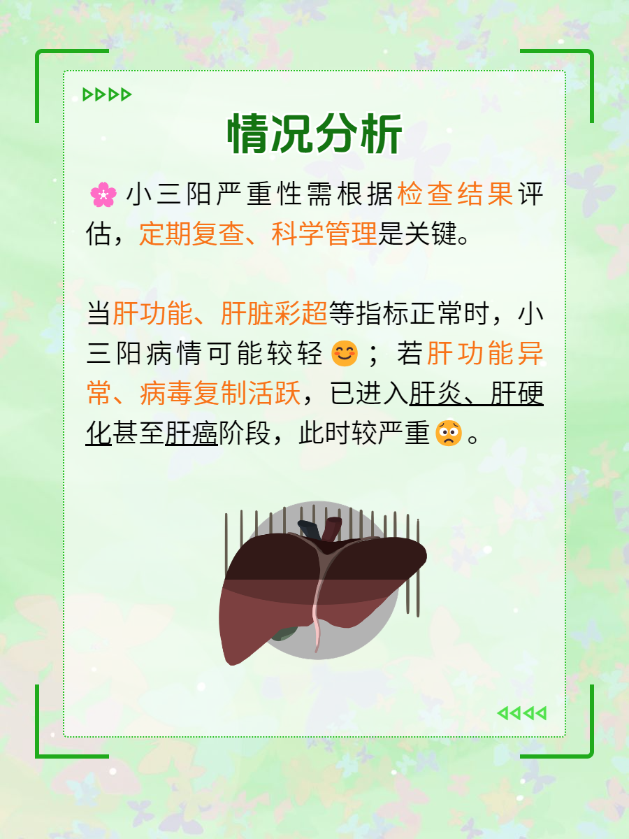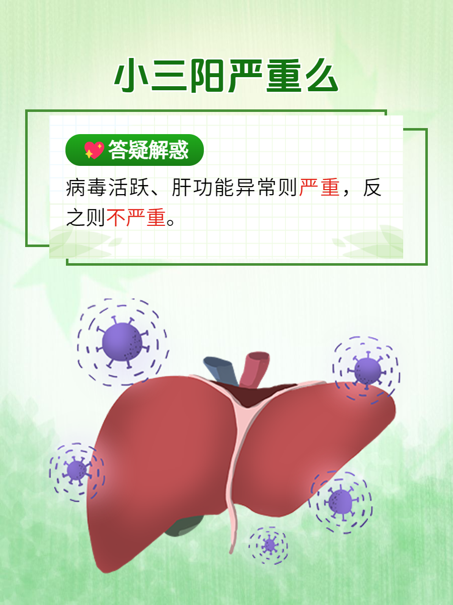 小三阳并不是疾病的严重程度标签,只是乙肝病毒感染的一种状态。具体来说,就是乙肝表面抗原、e抗体和核心抗体三项阳性。这表示体内有乙肝病毒,但复制相对不活跃,传染性较低。然而,小三阳是否严重,还得看具体情况。