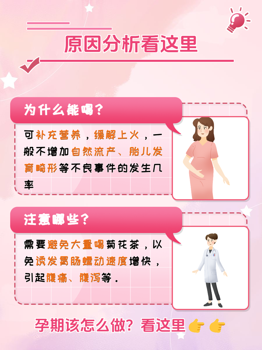 需要提醒大家,菊花茶的好处虽然比较多,但不适宜过量饮用,以免诱发腹痛、腹泻等现象😖。此外,在孕期我们还需要注意适量补充营养、保持平和心态、定期产检🔔这些事项,为宝宝的生长发育保驾护航。