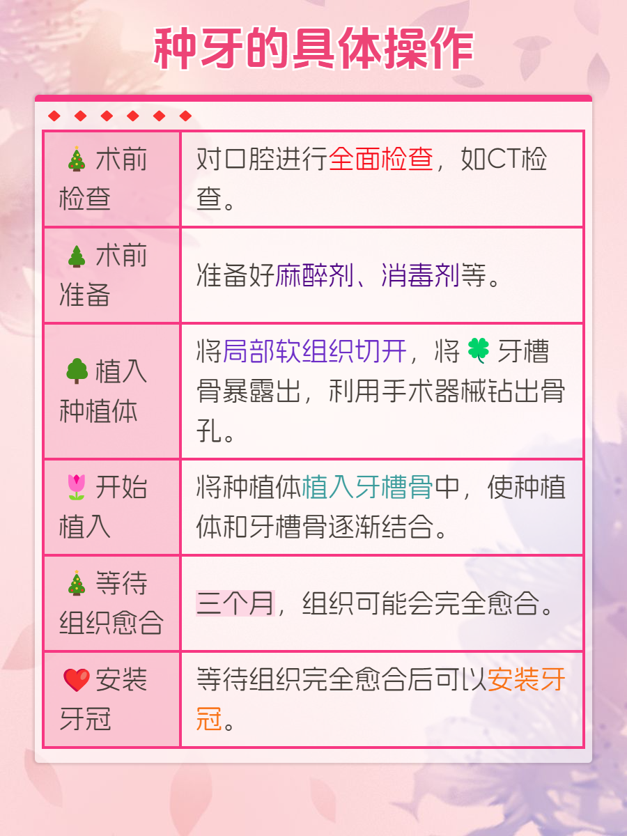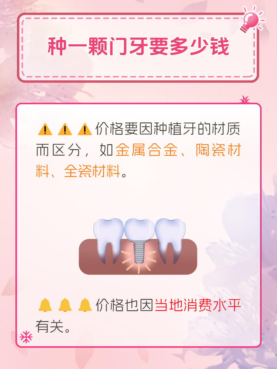 🍀除此之外,种一颗门牙的价格也与当地的消费品有很大关系。如果当地消费水平较高,费用可能会较高,能达到上万元;如果当地消费水平较低,费用一般在数千元。建议结合自身的实际情况,考虑合适自己的材质进行种牙,种植牙之后也有许多的日常注意事项,需要好好牢记一下,如下: